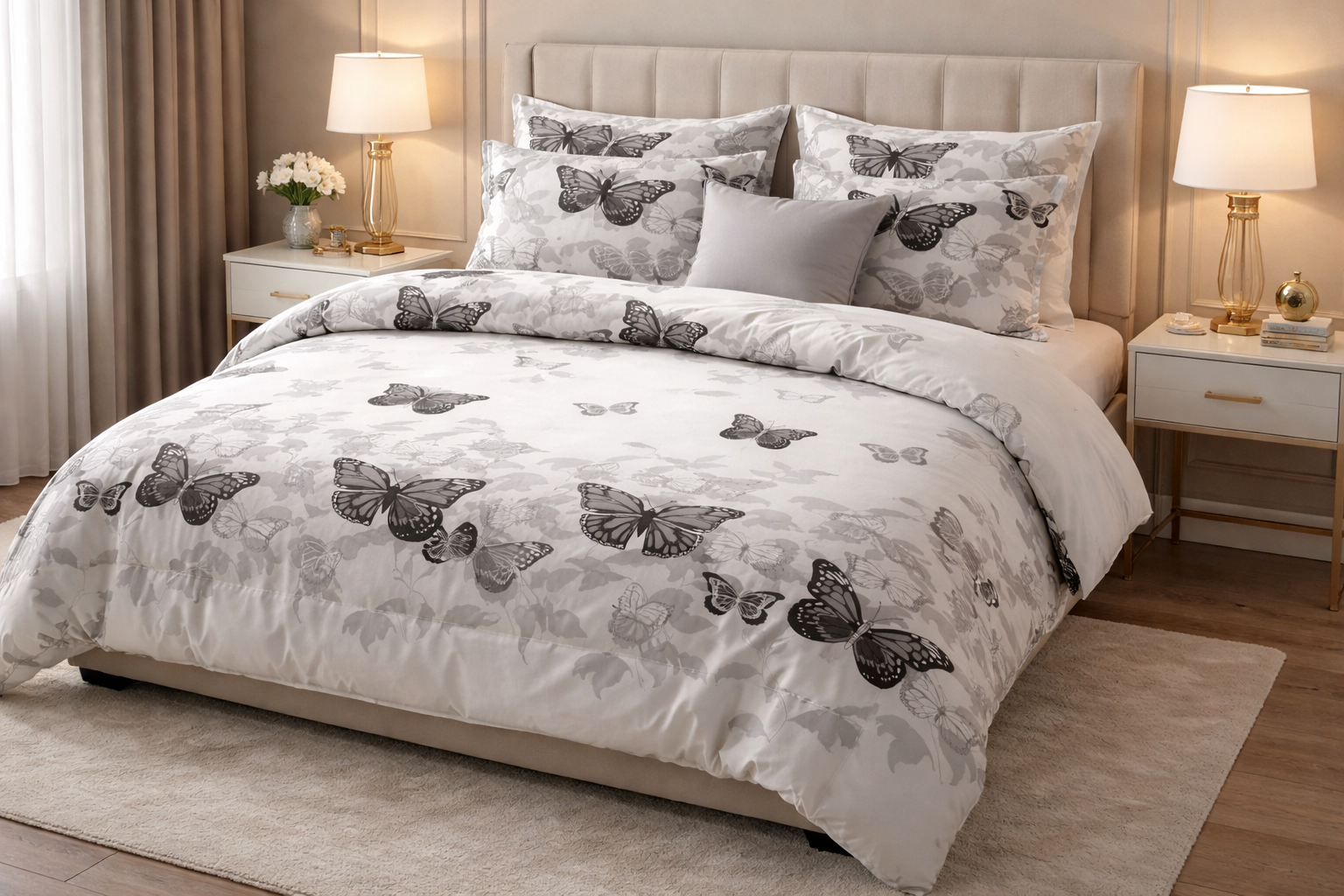 Elegancki wzór motyli w subtelnych odcieniach czerni, bieli i szarości wprowadza do sypialni lekkość, harmonię i ponadczasową elegancję.