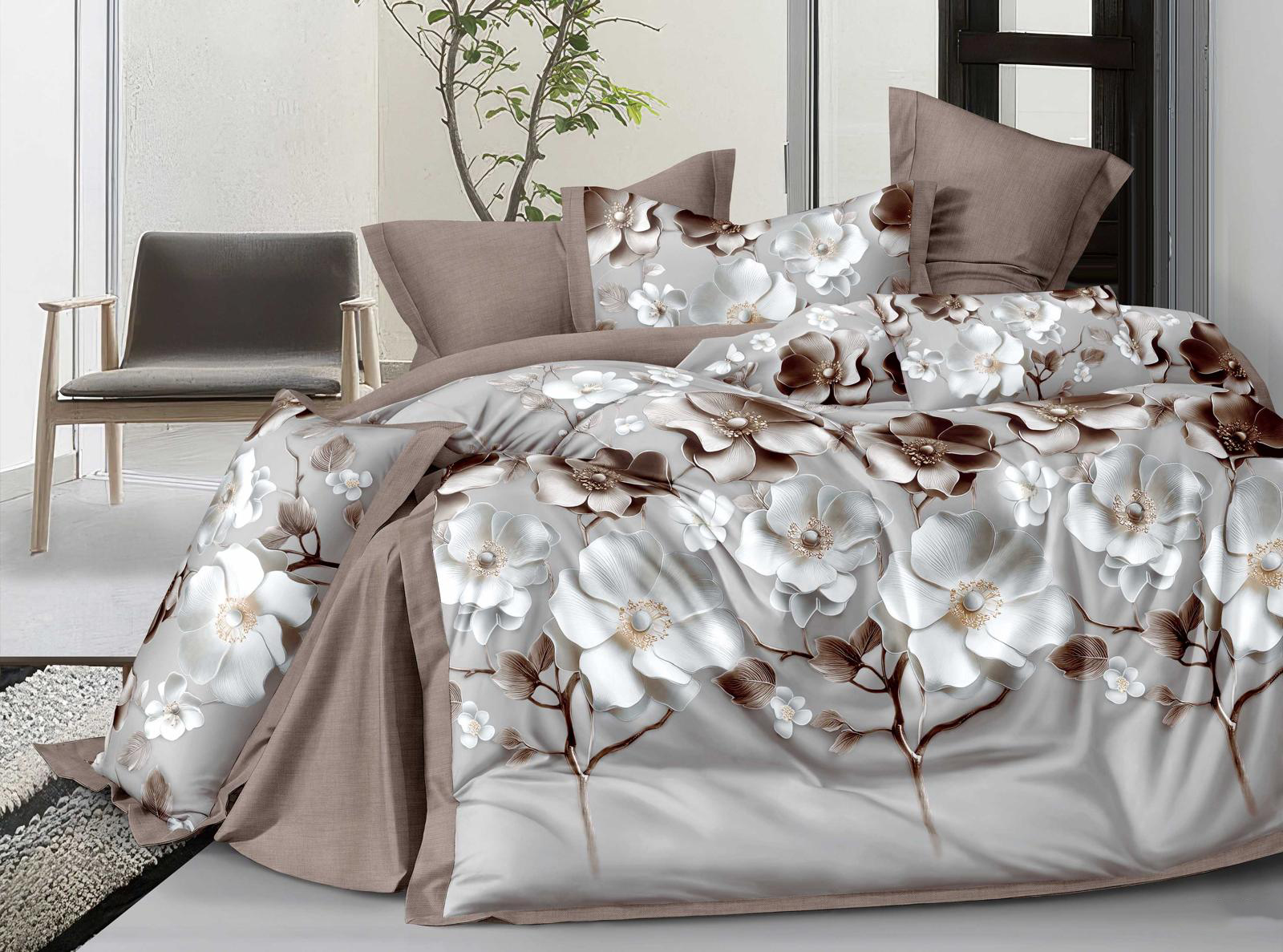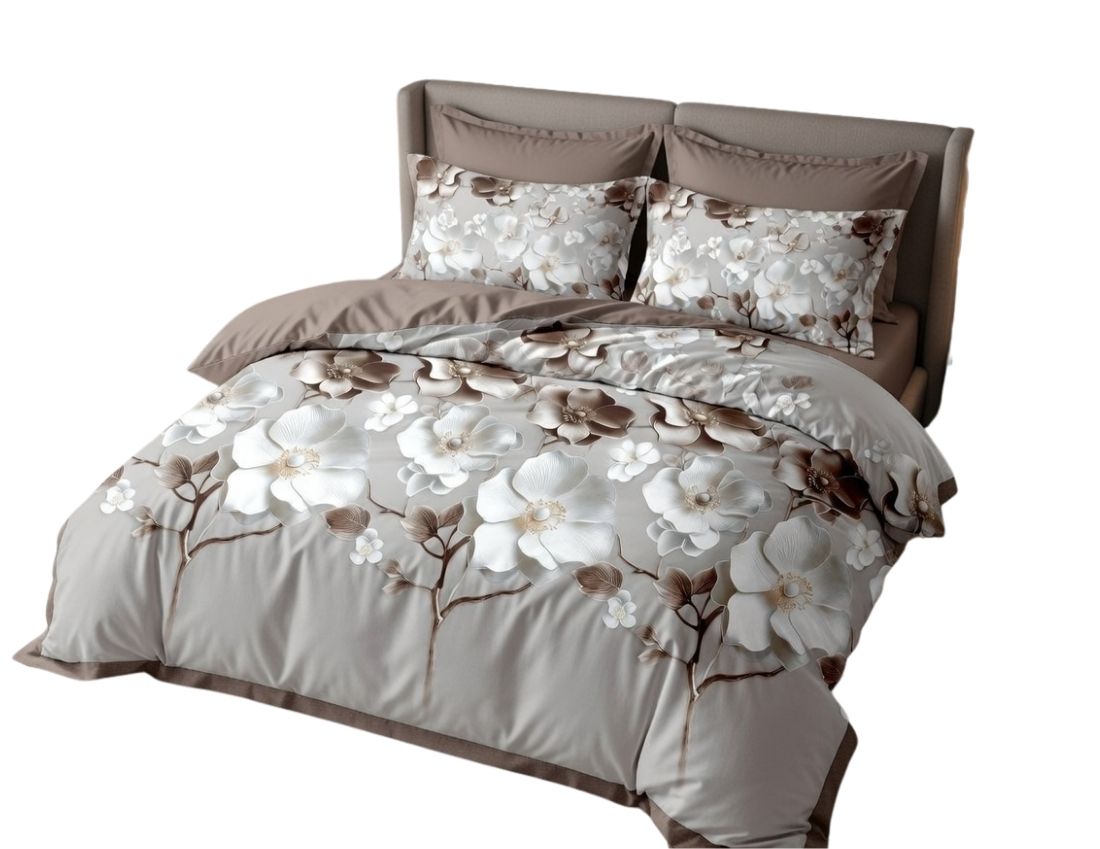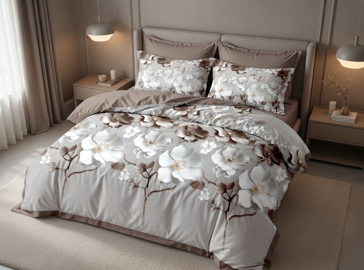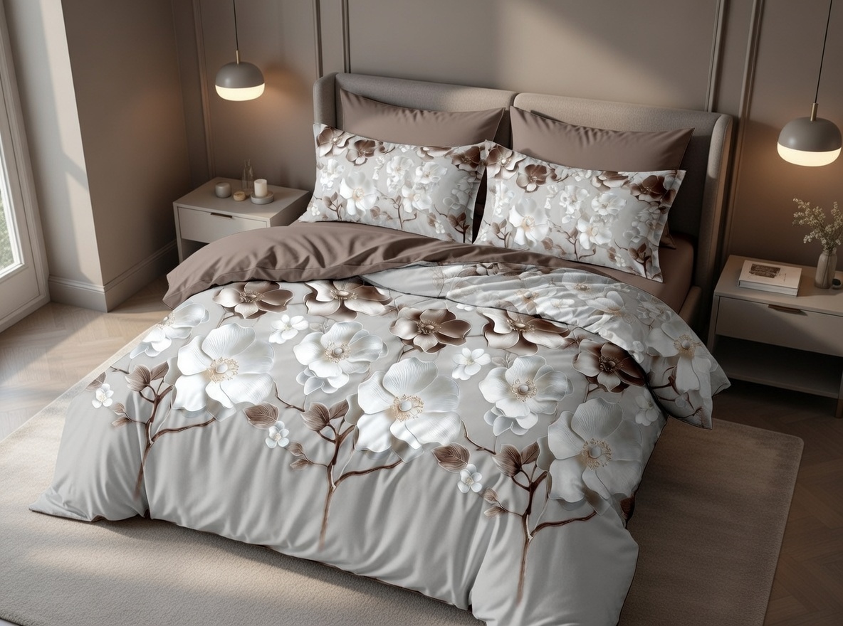 Klasyczna i elegancka pościel szaro beżowa w kwiaty.