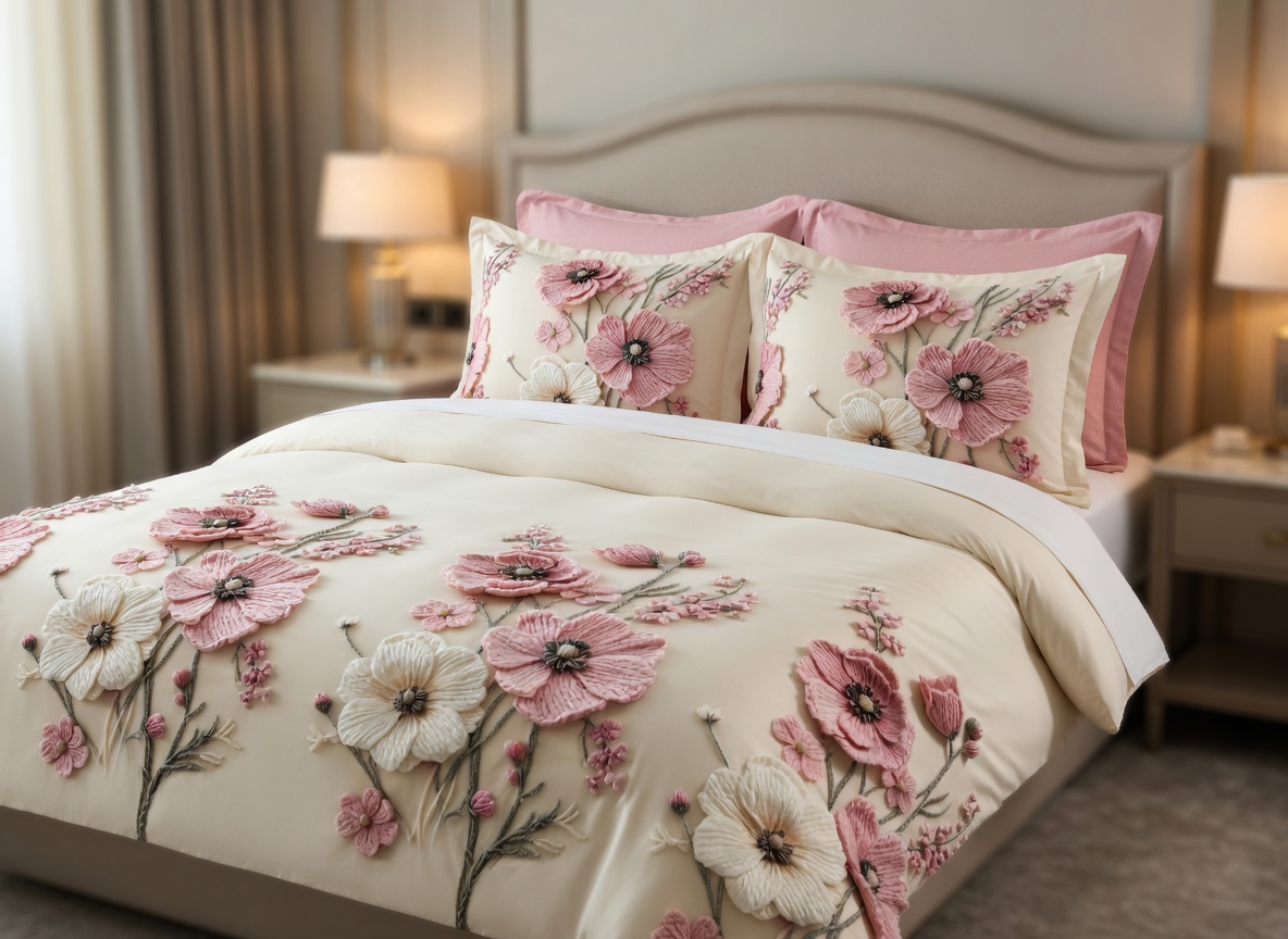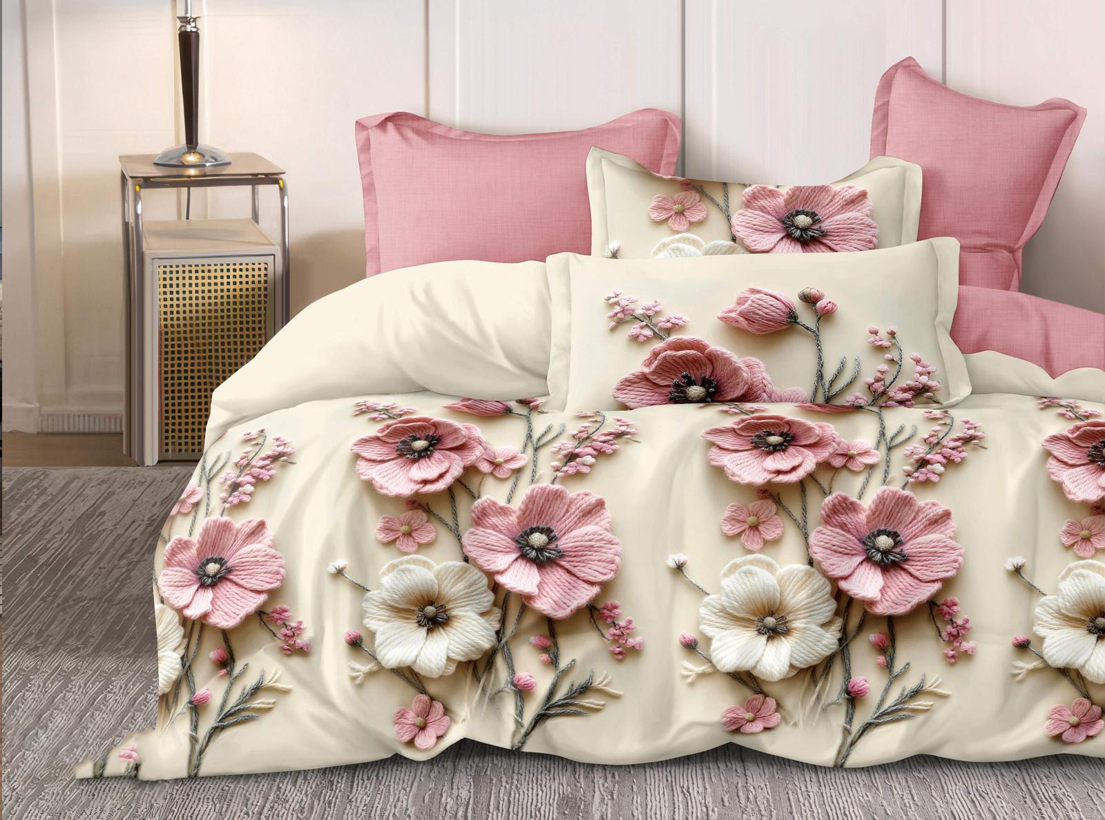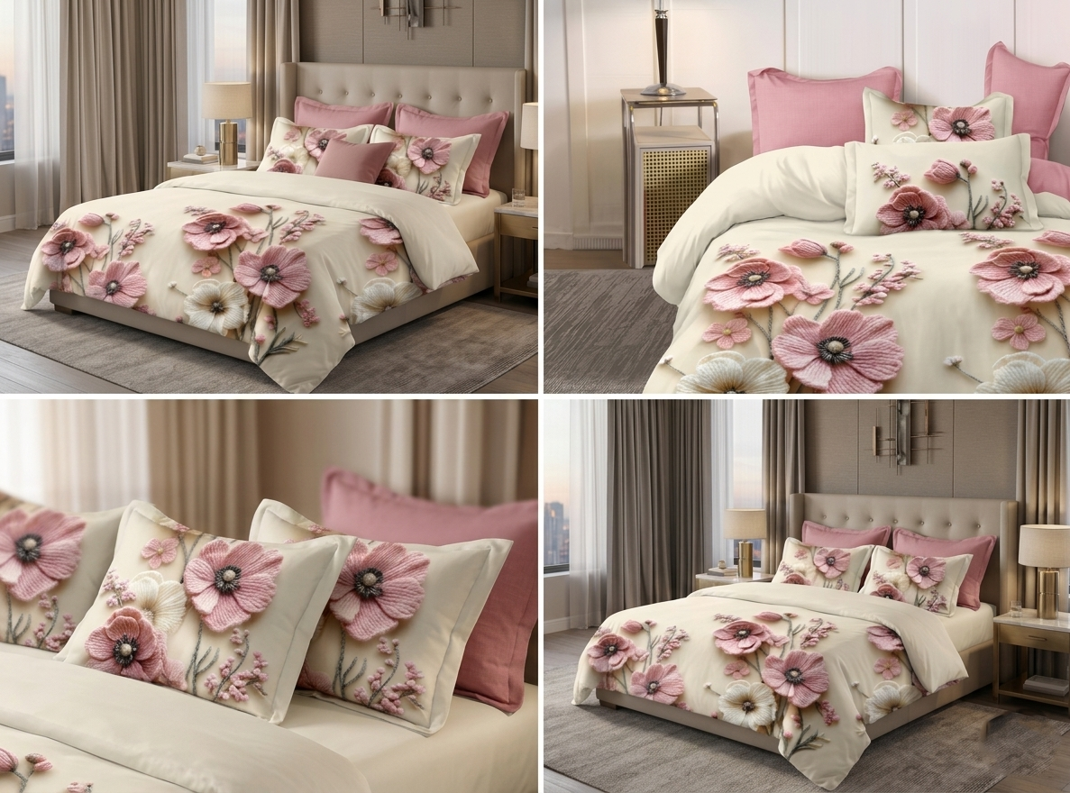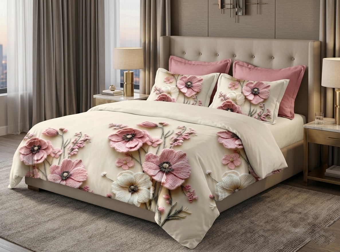 Elegancki wzór dużych kwiatów w pastelowych odcieniach różu i kremu nadaje pościeli subtelny, romantyczny charakter. Delikatna kolorystyka sprawia, że komplet doskonale pasuje do jasnych, nowoczesnych oraz klasycznych sypialni.