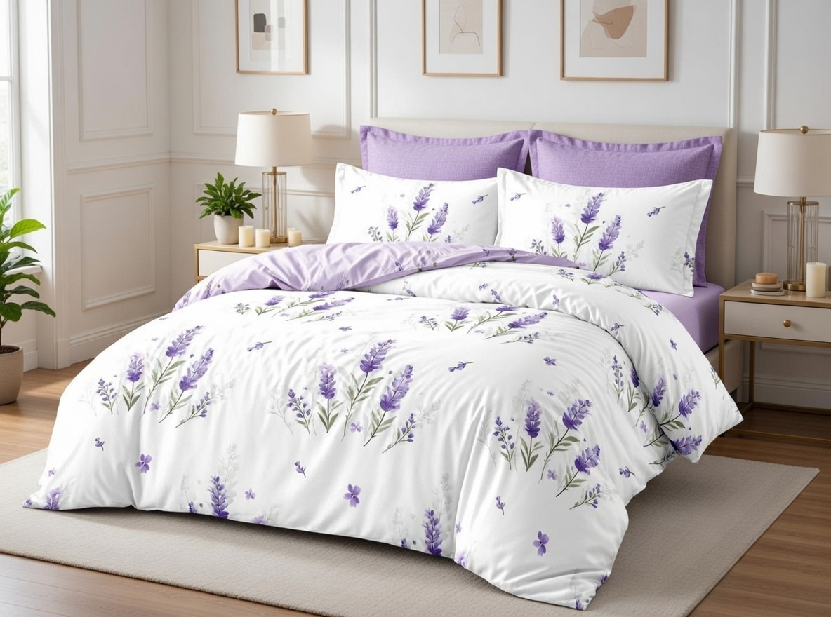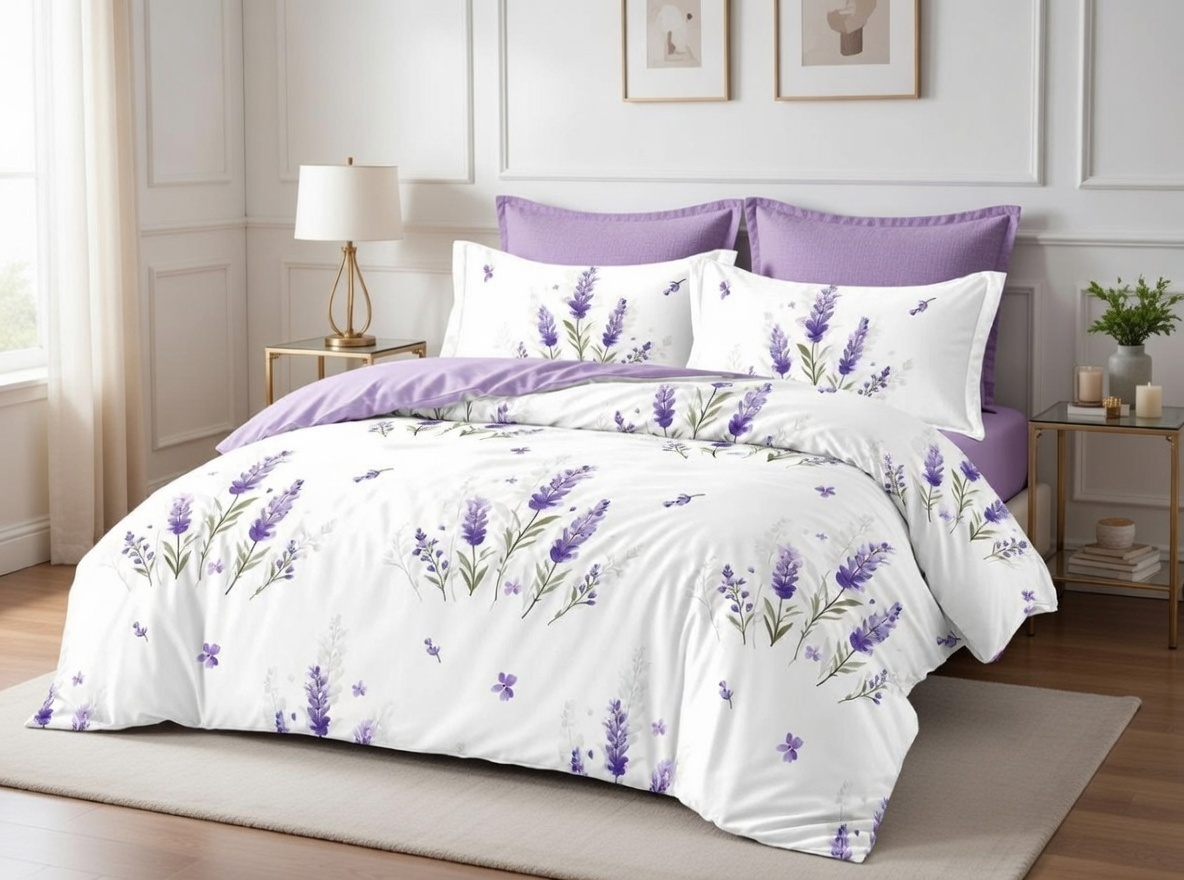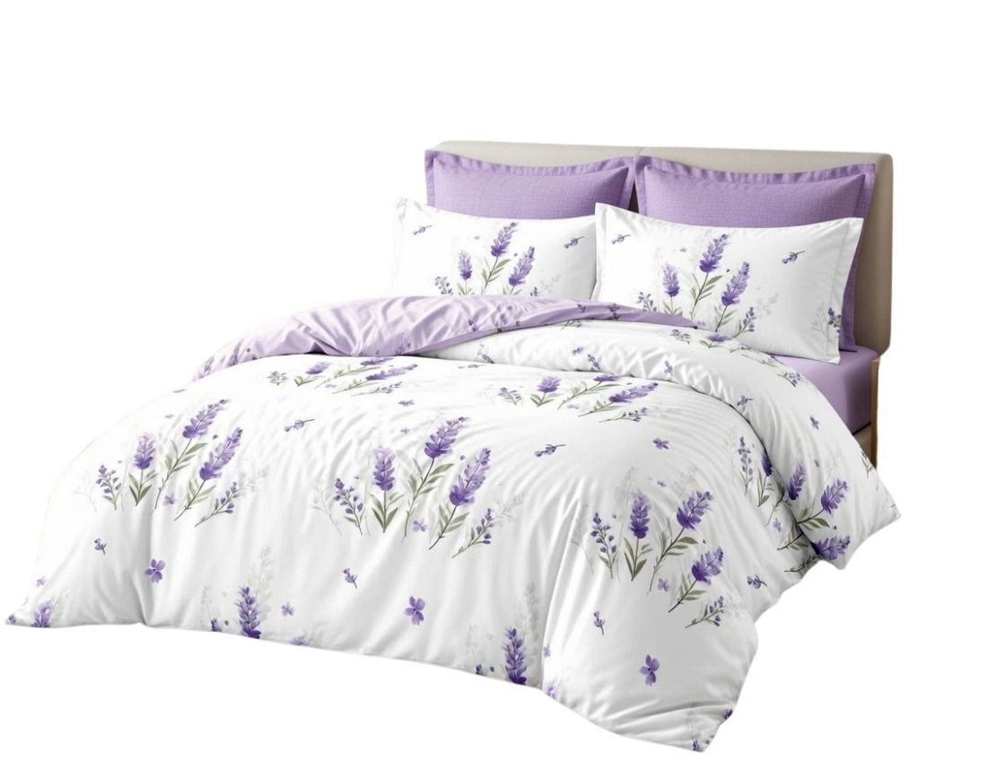 Pościel z kolekcji to wyjątkowe połączenie elegancji i naturalnej subtelności. Motyw lawendowych kwiatów na jasnym tle nadaje sypialni lekkości oraz przytulnego charakteru, tworząc atmosferę sprzyjającą relaksowi i spokojnemu wypoczynkowi.