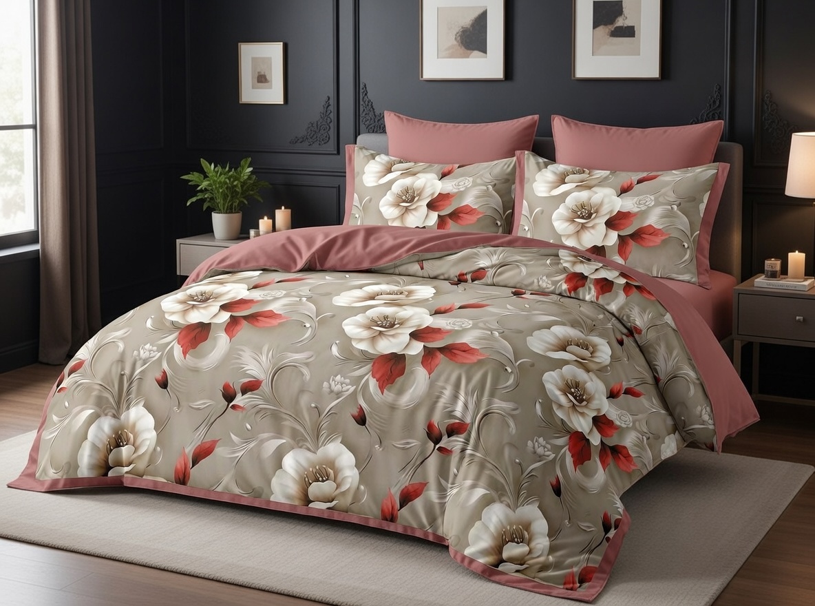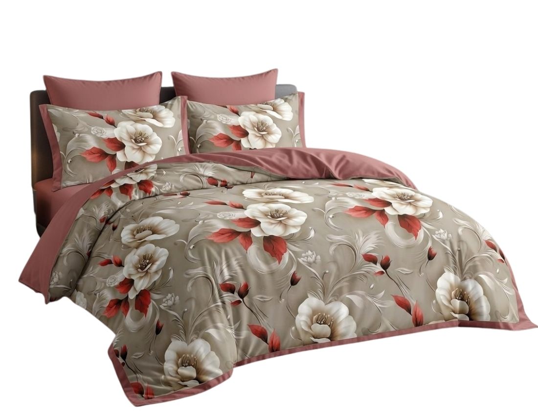 Elegancki komplet inspirowany naturalnym pięknem kwiatów. Delikatne jasne kwiaty w połączeniu z subtelnymi czerwonymi akcentami tworzą wyjątkową kompozycję, która nadaje sypialni luksusowy i przytulny charakter. Stonowana kolorystyka doskonale komponuje się zarówno z nowoczesnymi, jak i klasycznymi aranżacjami wnętrz.