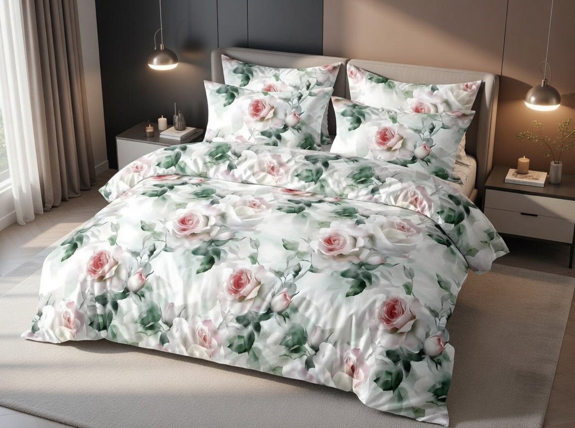 Pościel wysokiej jakości o satynowym splocie z pięknymi fioletowymi i białymi kwiatami, wykonana z bawełny satynowej. Ten rodzaj tkaniny wyróżnia się delikatnym połyskiem. Materiał naturalny - oddychający co w znacznym stopniu poprawi jakość snu. Dodatkowo bezpieczny dla zdrowia, nawet dla najmłodszych. Pościel jest niesamowicie miękka i bardzo miła w dotyku. Pościel jest starannie uszyta, dzięki czemu jest trwała i będzie nam długo służyć. Postępując z wskazówkami producenta pościel jeszcze dłużej będzie nas cieszyć.