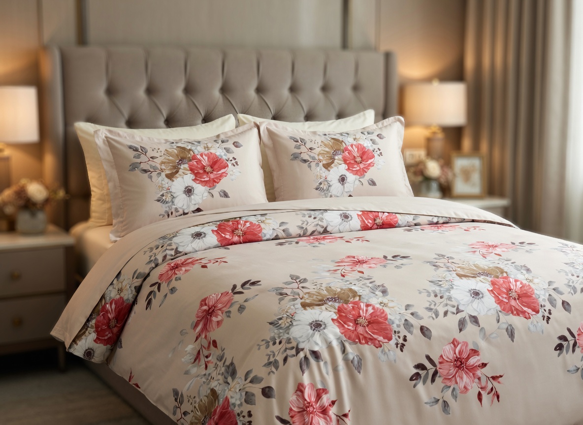 Delikatny wzór kwiatowy w eleganckich odcieniach czerwieni, beżu i kremu nadaje pościeli wyjątkowy, dekoracyjny charakter. Naturalna kolorystyka sprawia, że komplet doskonale pasuje zarówno do klasycznych, jak i nowoczesnych aranżacji sypialni.