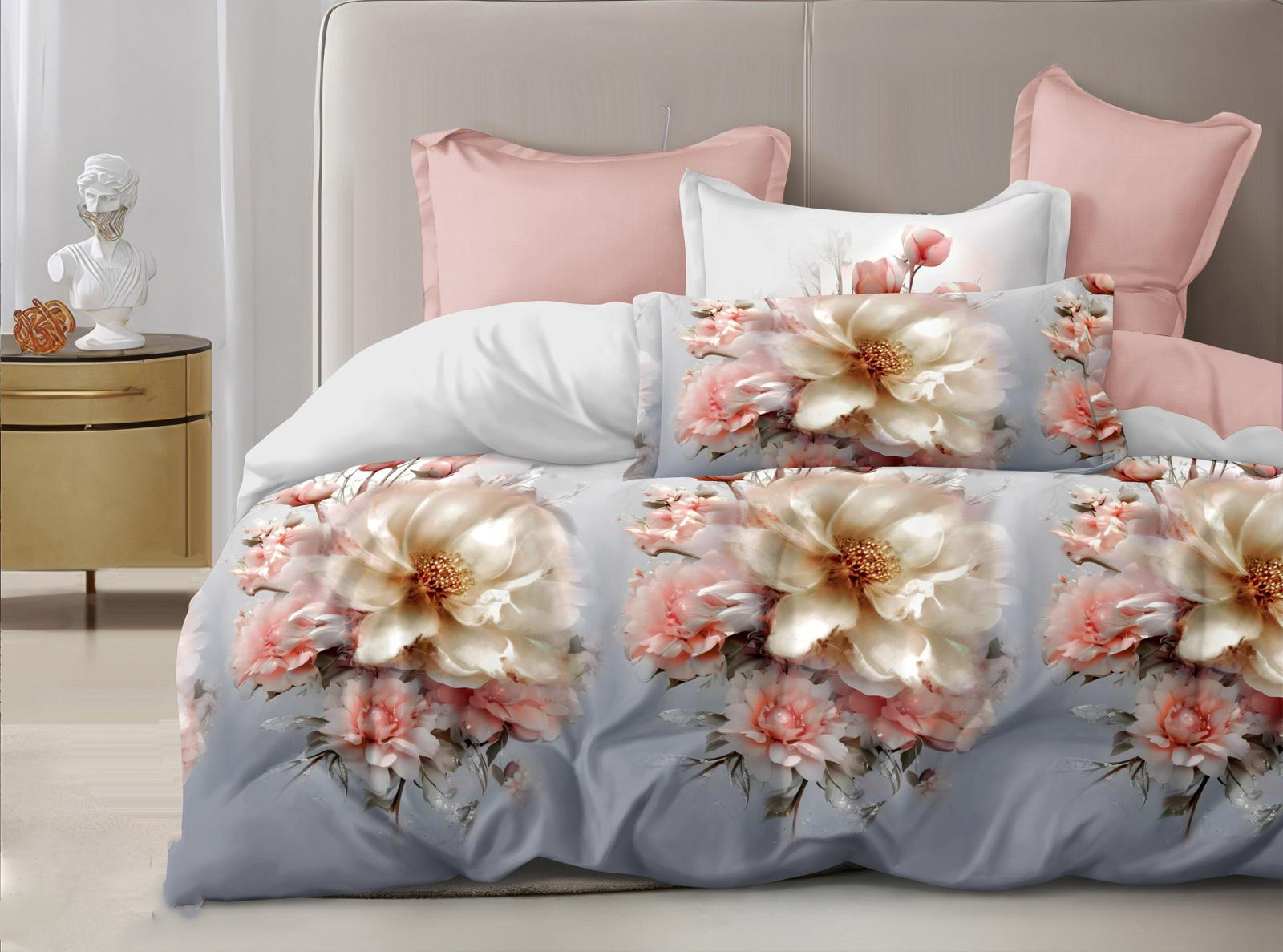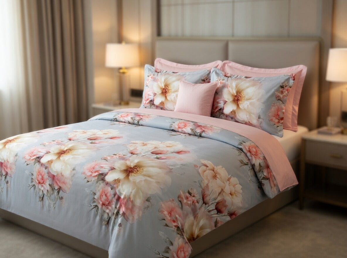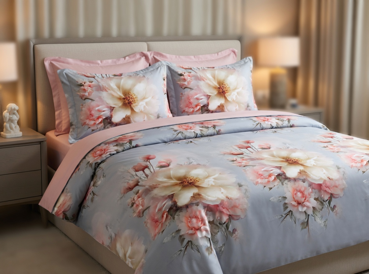 Duży, dekoracyjny motyw kwiatowy w pastelowych odcieniach różu i kremu nadaje pościeli elegancki i subtelny charakter. Stonowane tło sprawia, że komplet doskonale komponuje się zarówno z nowoczesnymi, jak i klasycznymi aranżacjami sypialni.