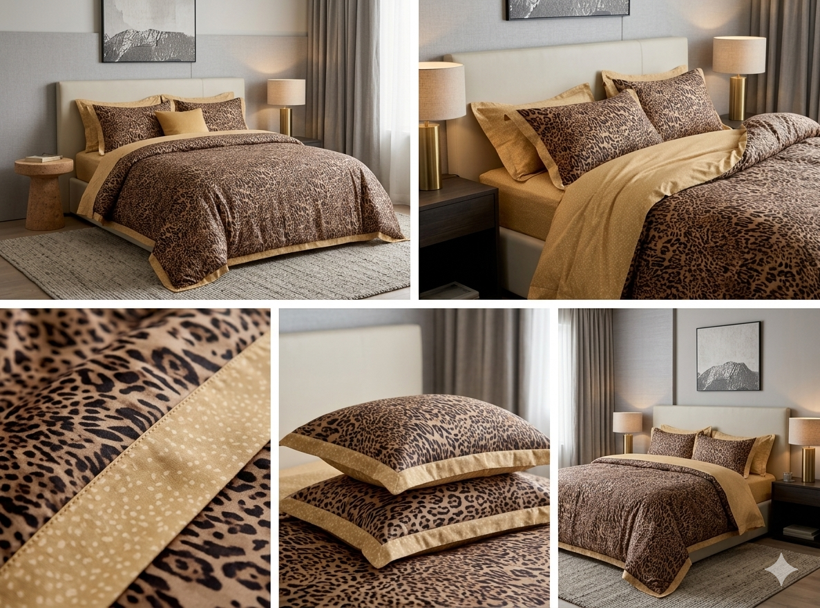 Wzór inspirowany motywem panterki nadaje pościeli nowoczesny i modny charakter. Naturalna kolorystyka w odcieniach brązu i beżu sprawia, że komplet doskonale komponuje się zarówno z eleganckimi, jak i nowoczesnymi aranżacjami sypialni.