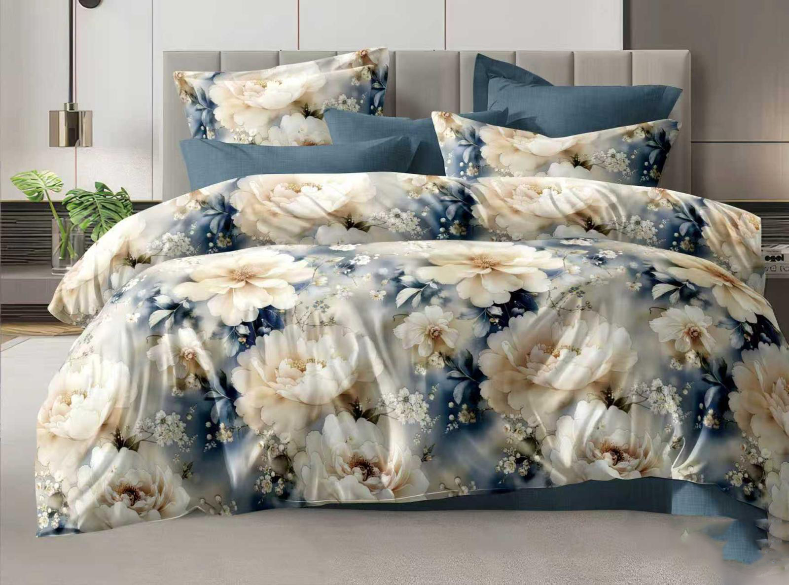 Elegancki wzór dużych kwiatów w subtelnych odcieniach kremu i bieli na głębokim granatowo-niebieskim tle tworzy wyjątkową, stylową dekorację sypialni.
